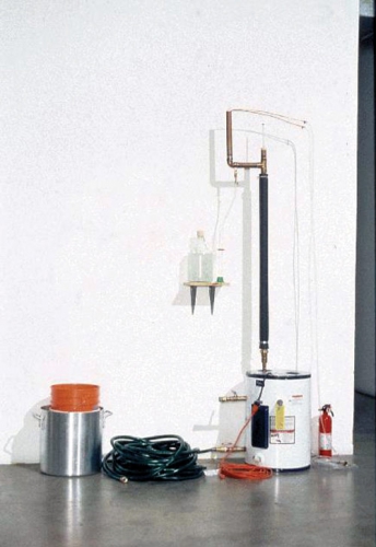 A functioning fractionating still (located in our secret gallery) made from household plumbing supplies distills corn whiskey.