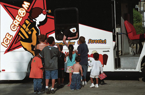 Combining a number of successful activist strategies (Food-Not-Bombs, Copwatch, Indymedia, infoshops, etc) into one mega-mobile, the TICU is the Voltron-like alter-ego of the cops’ mobile command center. Although the TICU appears to be a mild-mannered vending vehicle, it harbors a host of high-tech surveillance devices including a 12-camera video surveillance system, acoustic amplifiers, GPS, satellite internet, a media transmission studio capable of disseminating live audio/video, and of course, ice cream. With every free ice cream handed out, the sweet-toothed citizenry also receives printed information developed by local progressive groups. Thus, the TICU serves as a mobile nexus for community activities while providing frosty treats and food-for-thought.