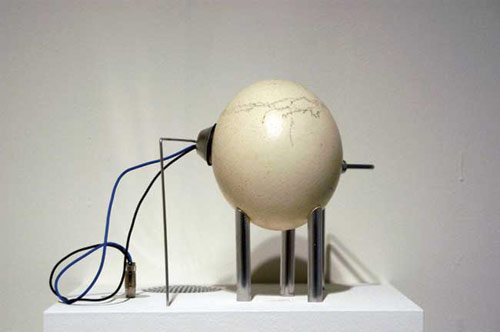 A distributed network of precarious egg-tapping robots. each unit, individually amplified, features a select unconventional egg. calculated sequences emerge, conducted by beautifully rendered software on a resurrected mainframe (a sweet mac LC3).=