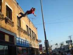 Part One: On Sunday July 6th at 6pm a stuntman will leap from Machine Project’s 2nd story window. We would like to invite folks to attend the leap, with a miniDV video camera (everyone’s got one nowadays, we can probably even supply you with one if you don’t). The videographers will be arranged in a large circle on the ground around the spot where the body will fall. They will document the leap and then turn over their video footage (tapes to be provided, unless you want to donate one). This footage will then be edited to create a very clumsy “Matrix” effect that suspends the stuntperson in mid-air with a 360 degree pan. We would like to get at least 40 people to film, so tell a friend.
