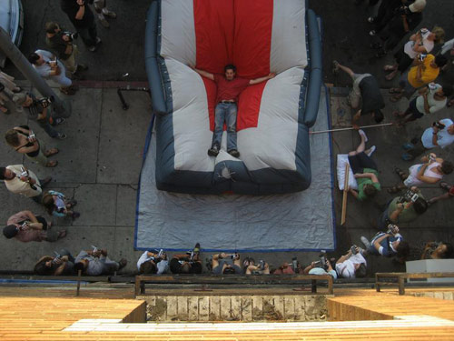 Part One: On Sunday July 6th at 6pm a stuntman will leap from Machine Project’s 2nd story window. We would like to invite folks to attend the leap, with a miniDV video camera (everyone’s got one nowadays, we can probably even supply you with one if you don’t). The videographers will be arranged in a large circle on the ground around the spot where the body will fall. They will document the leap and then turn over their video footage (tapes to be provided, unless you want to donate one). This footage will then be edited to create a very clumsy “Matrix” effect that suspends the stuntperson in mid-air with a 360 degree pan. We would like to get at least 40 people to film, so tell a friend.