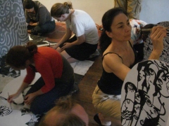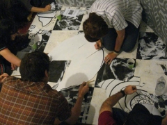 Participants are encouraged to experiment with methods of obliterative countershading and disruptive patterning. In addition to reconnoitering for concealed human forms, visitors work together to transform discrete animal shapes into an abstract mass indistinguishable from its background environment. Each line is used to form a field of real and potential illusion, as participants obliterate and decorate, continue and disrupt, reveal and obscure the marks made by others in the interest of creative collaboration. Sumi Ink and brushes will be available for all. Sumi Ink Club, founded in 2005 by Luke Fischbeck and Sarah Rara, holds regular public meetings in which many hands collaborate to create seamless topsy-turvy drawings using sumi ink. This event is for all ages.