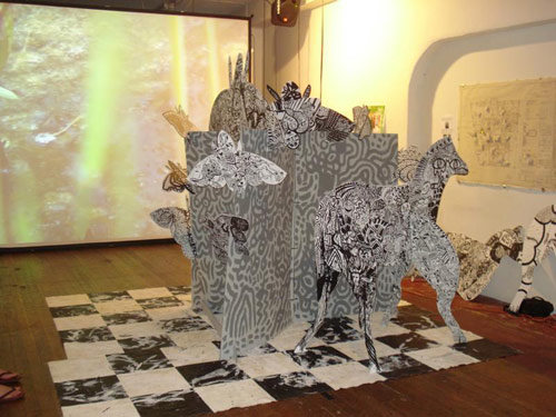 Participants are encouraged to experiment with methods of obliterative countershading and disruptive patterning. In addition to reconnoitering for concealed human forms, visitors work together to transform discrete animal shapes into an abstract mass indistinguishable from its background environment. Each line is used to form a field of real and potential illusion, as participants obliterate and decorate, continue and disrupt, reveal and obscure the marks made by others in the interest of creative collaboration. Sumi Ink and brushes will be available for all. Sumi Ink Club, founded in 2005 by Luke Fischbeck and Sarah Rara, holds regular public meetings in which many hands collaborate to create seamless topsy-turvy drawings using sumi ink. This event is for all ages.