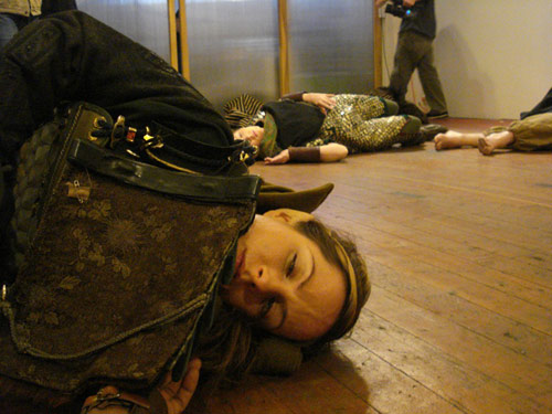 Ten performers outfitted in medieval/space/fantasy armor re-create Bruce Nauman’s 1973 work “Tony Sinking into the Floor, Face Up and Face Down”.