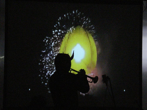 “Homemade electronic instruments (renaissance trompette coat, spoon bowl shinth) and channeling ghostal hippy fluttertalk to enraptured open-mouthed audiences.”