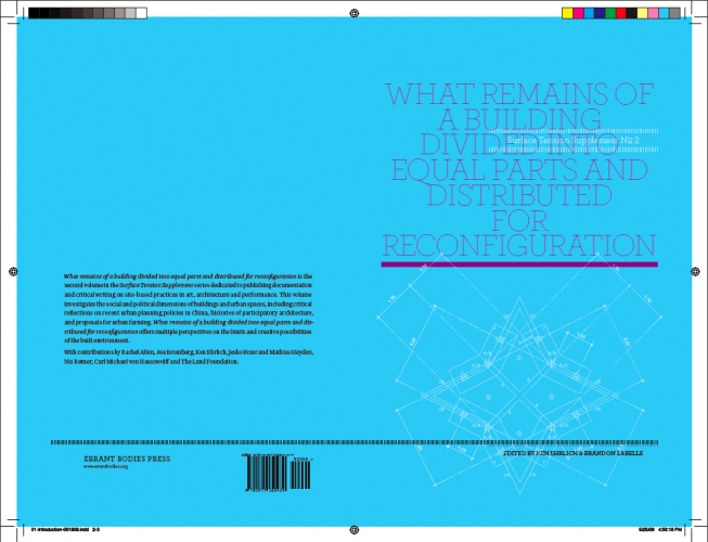 What remains of a building divided into equal parts and distributed for reconfiguration is the second volume in the Surface Tension Supplement series dedicated to publishing documentation and critical writing on site-based practices in art, architecture and performance. This volume investigates the social and political dimensions of buildings and urban spaces, including critical reflections on recent urban planning policies in China, histories of participatory architecture, and proposals for urban farming. What remains of a building divided into equal parts and distributed for reconfiguration offers multiple perspectives on the limits and creative possibilities of the built environment.