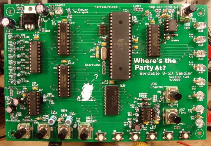 Interestingly, the past year saw the sampler Todd built (christened “Where’s the Party At?”) go through its own lurching set of fetishizations as it made its way from Proof-Of-Concept board to a full-featured open-source DIY kit which explicitly took advantage of and selectively played up the crusties he had sought to characterize. WTPA went from a simple looper to a multi-timbral, multi-bank, MIDI-enabled, 1-to-8 bit sampler with multiple clock sources, tons of selectable “errors” to introduce into the signal path, and any number of bad hip-hop jokes in the silkscreen. Furthermore, WTPA was designed with the circuitbender in mind (it is repairable, brings clocks off-chip whenever possible, and has impedances scaled to make “body contacts” easy to realize) and is designed to sneak some “design ideas” into good natured tinkering and less-good-natured noise-rock crust.
