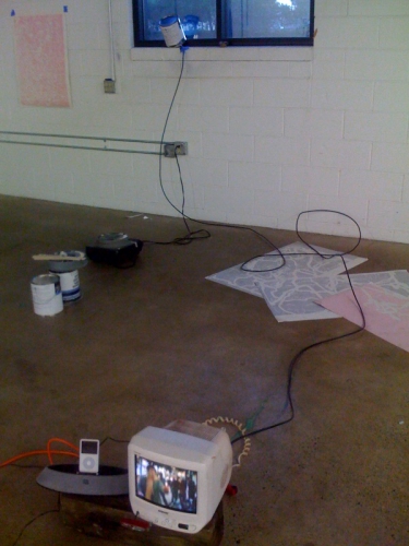 “Wow. You know, I have a lot of intense feelings about this ( loss of the analog signal…static, or bad reception) I’ve been thinking about it off and on for a long time. Wish I could be there. I’m having my own lil’ moment here in my temp studio with an old familar studio friend of 11 years from japan… my 9” Sony trinatron. A photo is included with the last improvised antenna that i’ll ever make. Instant presence in lonely temporary studio. It could get a picture from just sticking a cable cord in it and touching something metal. A beautiful thing indeed.”