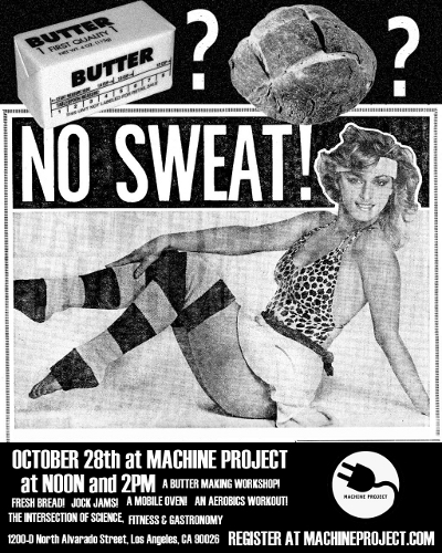 Artist Michael O’Malley will teach amateur breadmakers the art of baking on the grill outside the Machine Project gallery. Inside, Pop Soda’s Jimmy Fusil conducts an aerobics class/buttermaking workshop, shaking jars of fresh cream until it magically transforms into butter!