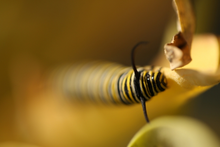 In 10 to 14 days, the tiny larvae, less than an eighth inch long, emerge and begin eating the plant. It’s a fascinating process as they munch away, growing larger everyday. Equally fascinating is watching the caterpillar leave the plant to form a chrysalis.